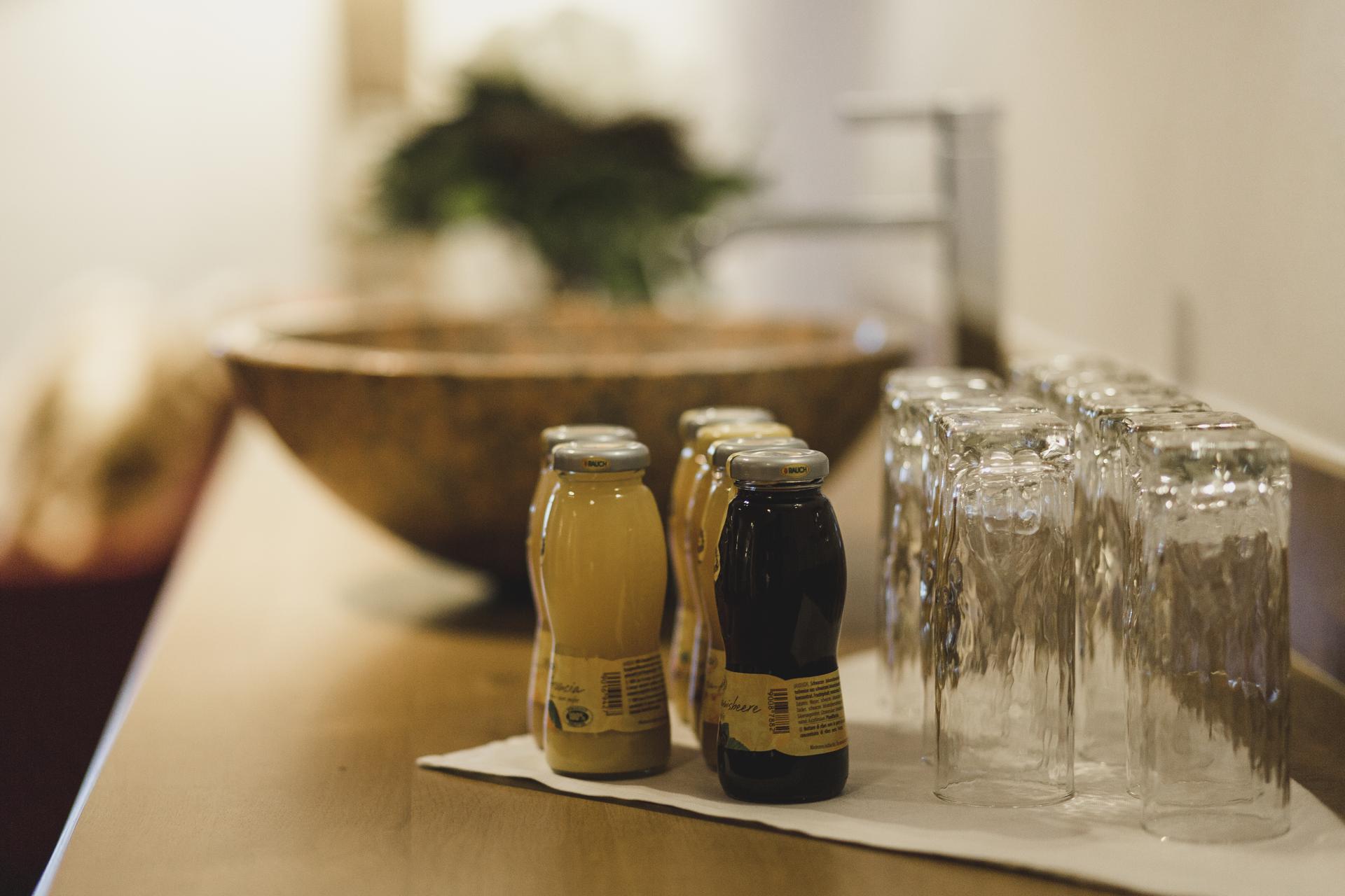 Den ganzen Nachmittag über genießen Sie kostenfrei Premium-Fruchtsäfte, Bio-Kaffee und Bio-Tee vom Buffet. Zum Abendessen stehen Ihnen ebenfalls hochwertige Säfte und zusätzlich eine Auswahl an Weinen bereit.